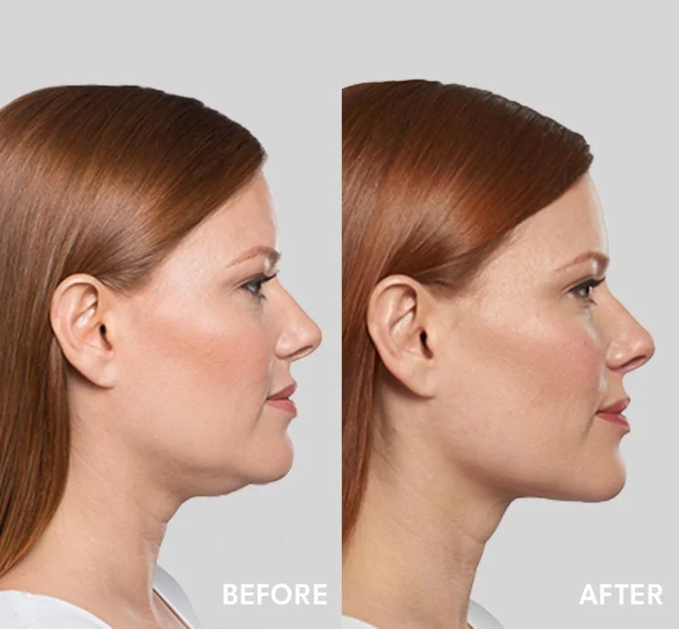 Kybella, or Deoxycholic acid, is a fat dissolver. It is injected into areas where there is unwanted fat, most commonly the submental (under the chin) area, but we also love it for the jawline and buccal areas on the right patient. Kybella breaks down the fat cell membranes, destroying them, reducing the number of fat cells in the targeted area by up to 25% per treatment. Depending on the size of the area and treatment goal, multiple treatments are generally recommended. You can also treat fatty pockets on the body if Coolsculpting is not an option for you. And we highly recommend combining it with a skin tightening treatment and topical skin tightening cream! Kybella will make you swell so make sure that you plan for downtime accordingly.